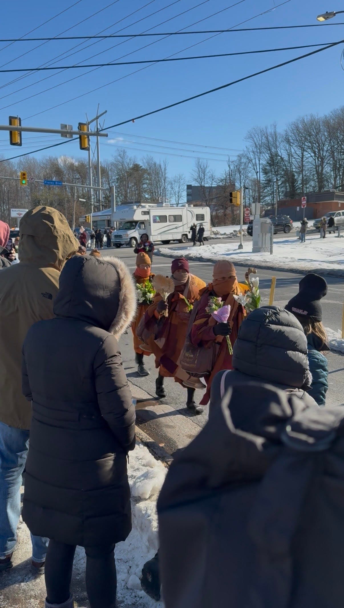 People kindly crowded in closer to hear, standing on piles of snow, sitting on trunks of cars, and standing on slippery sheets of ice. Some people were carrying flowers to give to the monks, others were handing out hand warmers, I brought small cards of poetry and inspirational stickers to hand out to people!